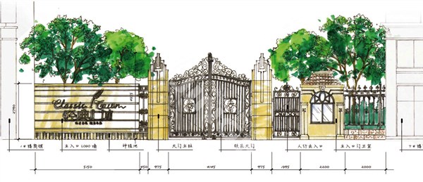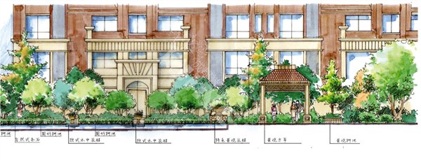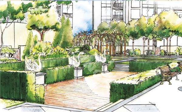 该项目的建筑为简欧风格的高层建筑。针对项目的规划定位,将有古典英伦文化氛围和英式花园形态的景观元素融入整区景观的营造,通过设计中队雕塑、喷泉、花架、灯光、构筑物和其他小品的运用来体现。整个园区由建筑的排布分为一心两轴三组团。一心,为两条轴线的交汇处的园区中心景观;两轴,为主入口轴线、次入口轴线景观;三组团,则为小区建筑宅间绿地所营造的三个活动组团空间。